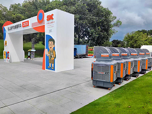 4.安全性能同样出色。整机采用8.8级高强度螺栓配合乐泰螺纹锁固剂防松处理,底部防滑设计有效防止意外移动,即便在复杂户外环境中也能保持稳定运行。从亲子跑休息区到大型展会开放场馆,瑞泰风始终可靠地输送清凉。